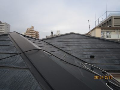 コロニアルは厚さ5mm程度の薄い板状の屋根材でセメントを主成分とし塗装により保護され塗膜性能が失われると強度が低下し割れたり反ったりします。