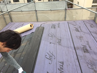 屋根から漏水しないよう、べニア下地の上に防水シートを水下から水上方向へ100mmの重ねをとりながら貼ります。上側のシートが下側のシートに上からかぶることで屋根の下に雨水が入ることを防ぎます。