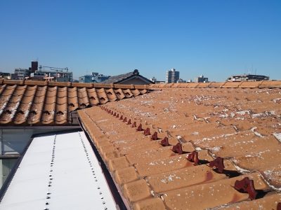 先端部に屋根材を設置したら、次は中央にかけて屋根材を設置していきます。棟部分に下地となる貫板をビス止め固定をし貼ります。強風の影響により浮いたり剥がれたりしないよう強固に止めます。