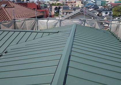 色はモスグリーンで優しい色合いですが、屋根材はガルバリウム鋼板という薄くて頑丈で耐久性に優れた屋根材を使用しています。また重さも軽いので地震の影響が少ないのも特徴です。