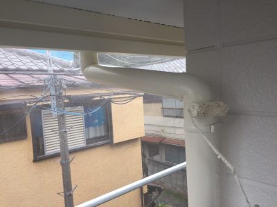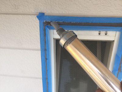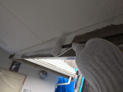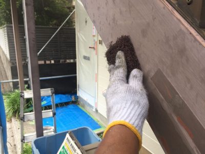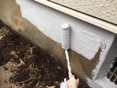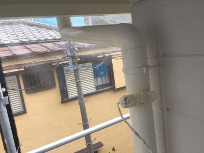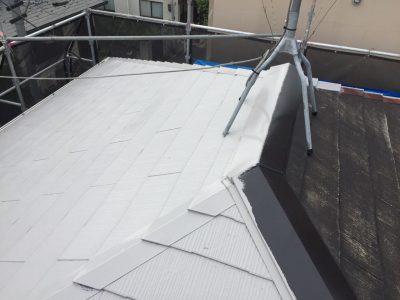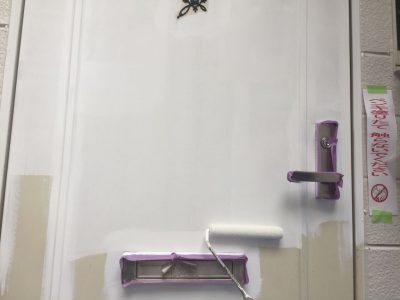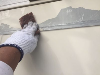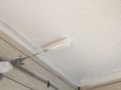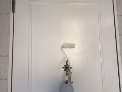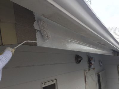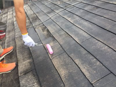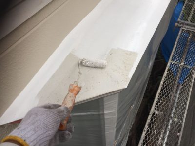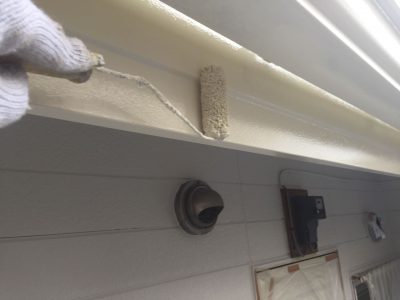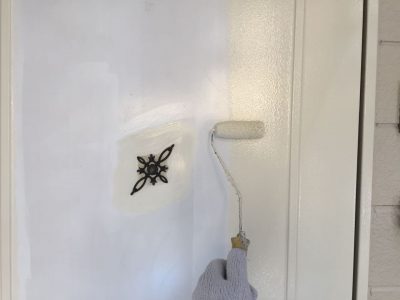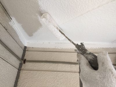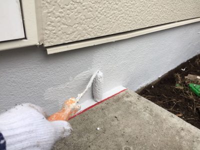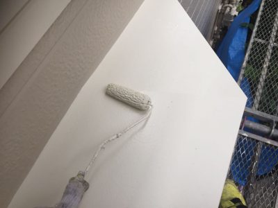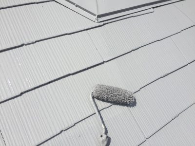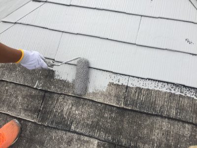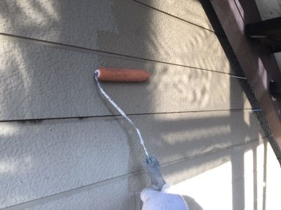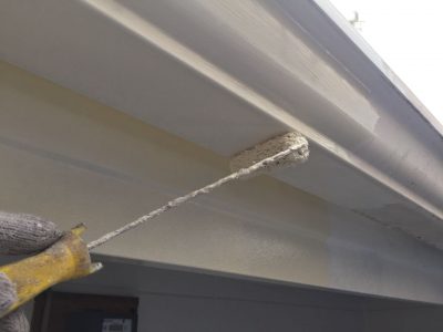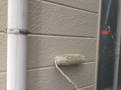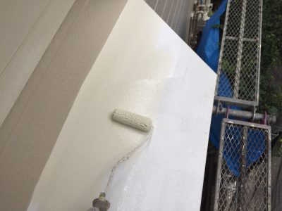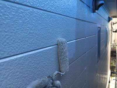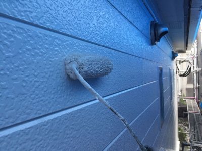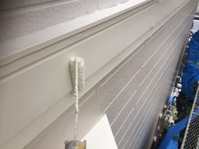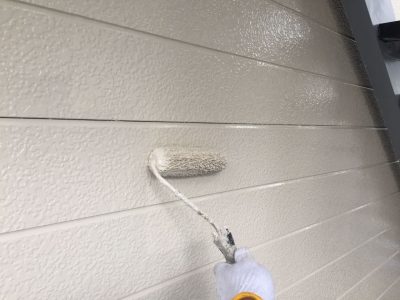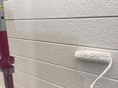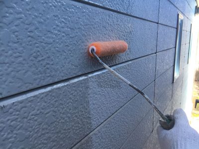 3回塗りの2回目の中塗り作業です。手塗りのローラー工法で、3回も塗り重ねることを標準仕様としています。従来の吹き付け工法とは違い、施工実績豊富な職人が手塗りローラー工法で何度も塗料を重ね塗りすることによって、長期に渡り美しく耐久性の強い塗膜を生み出します。