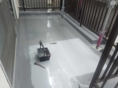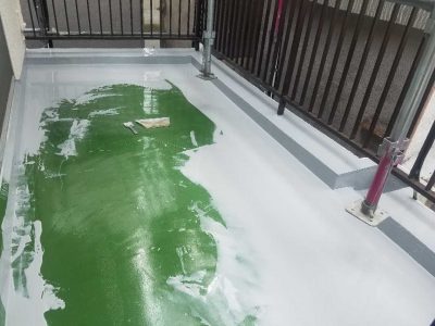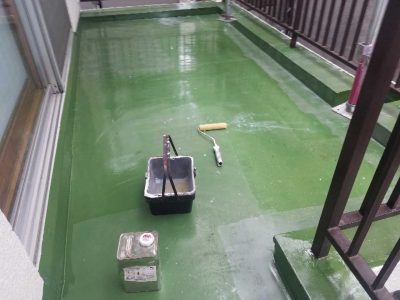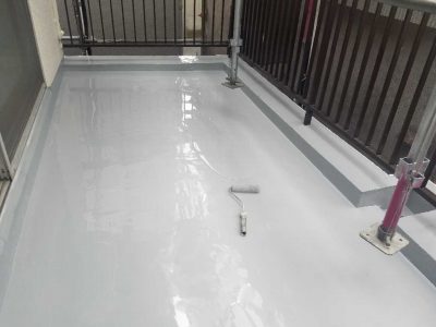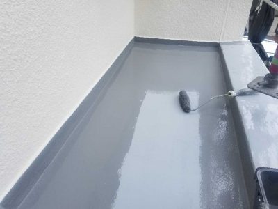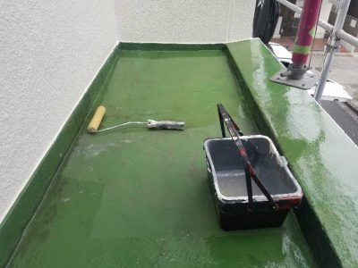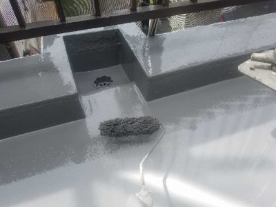 ウレタン主材の2層目を塗ります。防水塗膜は2回重ねで塗ります。立上りを塗ったら、屋上全体に2層目のウレタン防水主材を塗ります。