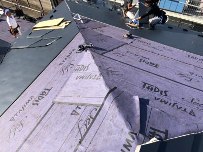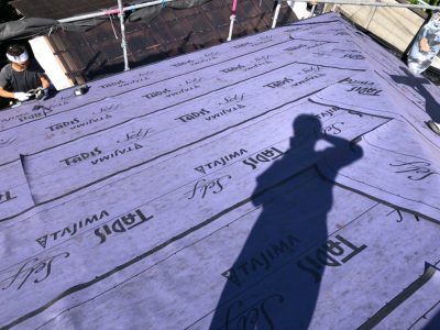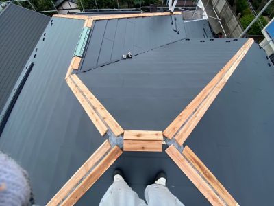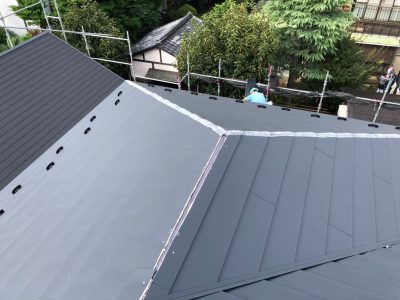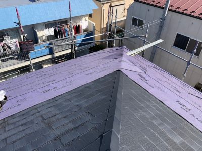 屋根カバー葺き工法 コロニアル屋根→防水シート貼り+ガルバリウム鋼板 雪止め金物取付け 横暖ルーフα 豊島区高松S様