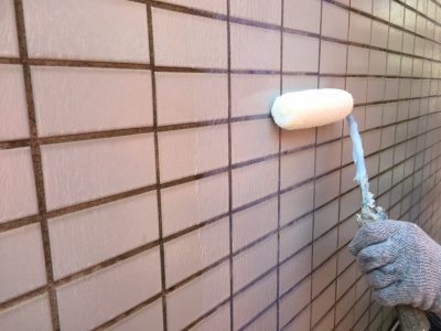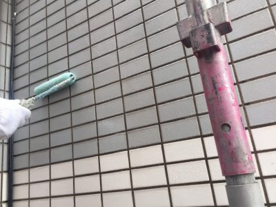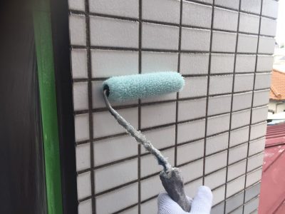 外壁タイル上塗りの様子です。2回目上塗りが終われば外壁タイル塗装は完了です。