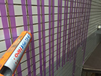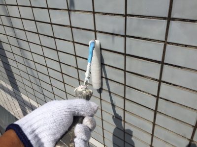 タイル目地全体の養生が完了したら、シールを増し打ちします。シーリングが終わったら、養生を取り除いて外壁タイルの塗装に入ります。今回の塗装は、タイル用のクリア(透明)塗料を下塗り1回、中塗り2回、上塗り2回、合計5回重ねで塗ります。