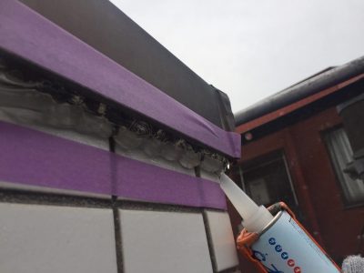 このような隙間が漏水の原因になる可能性があるためシーリングで施工をします。隙間まわりに養生を施し、シール材で隙間を埋めます。