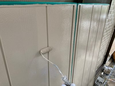 3回目の仕上げ塗装です。ムラ無く規定塗布量をしっかりと塗ります。塗料によって決まっている標準塗布量や乾燥時間をしっかりと守ることにより、強い塗膜を作ります。ローラーが使えない狭い箇所などは、ハケでしっかりと塗り込みます。同じ塗料を使用しても、塗り方によって耐久性が全く違ってきます!