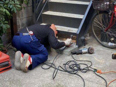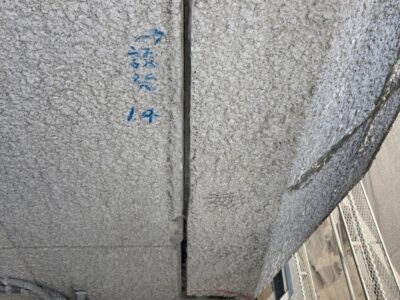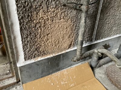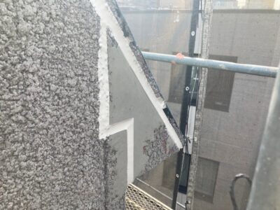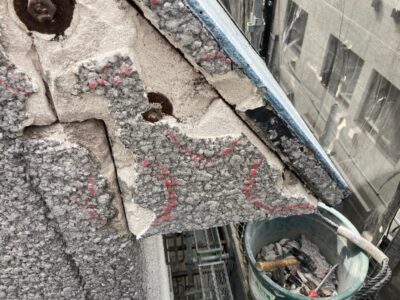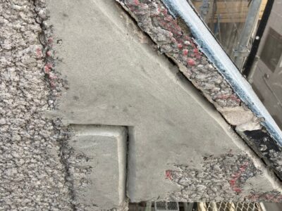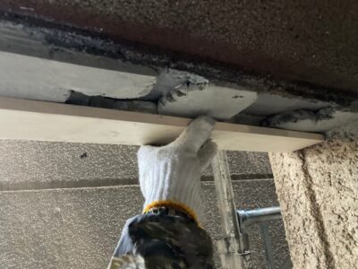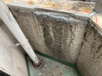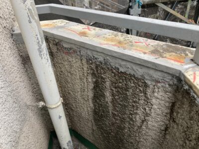 ALC建物の手摺上部のモルタル塗り笠木としている場合には浮いていることがあります。内側が空間になっている場合にはエポキシ樹脂注入が出来きません。今回はすでに爆裂している状態でしたので斫り撤去をしました。