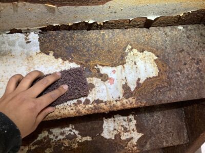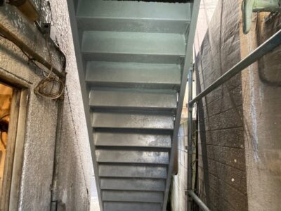 鉄骨階段裏のサビ落としをしています。