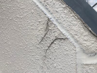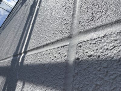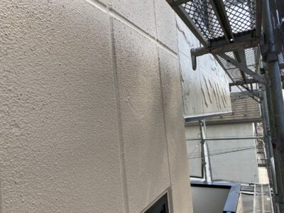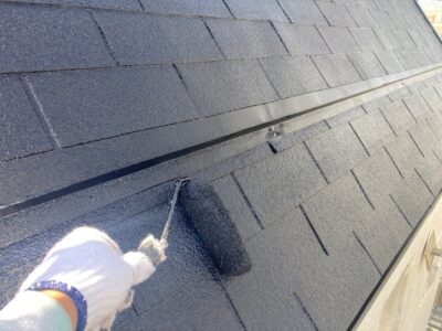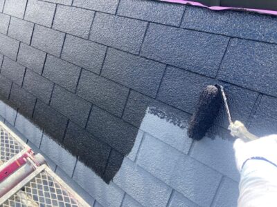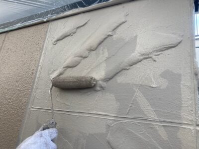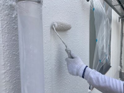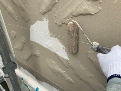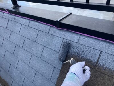 3回塗りの2回目の中塗り作業です。手塗りのローラー工法で、3回も塗り重ねることを標準仕様としています。従来の吹き付け工法とは違い、施工実績豊富な職人が手塗りローラー工法で何度も塗料を重ね塗りすることによって、長期に渡り美しく耐久性の強い塗膜を生み出します。