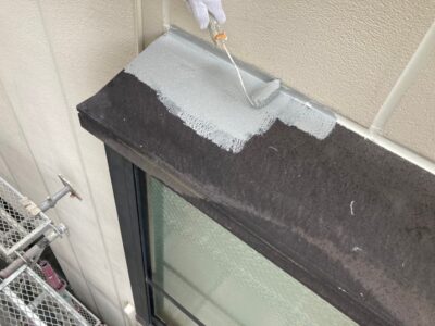 軒樋の下塗り作業で仕上げ塗料材料です。ローラーが使えない狭い箇所などは、ハケでしっかりと塗り込みます。