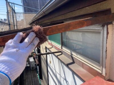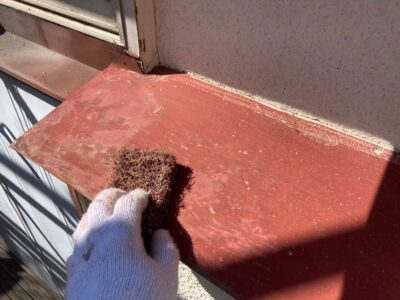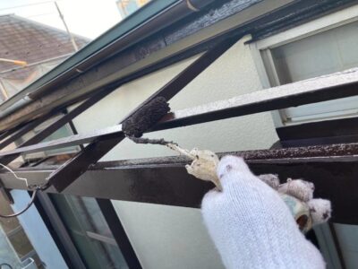 付帯鉄部のサビ落とし処理をしています。