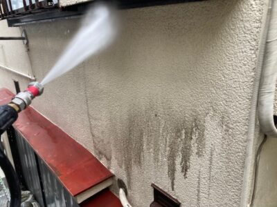 外壁塗装を行う上で必ず必要な工程の1つが外壁のバイオ高圧洗浄です。 現状の外壁の汚れを洗い落とし、清潔な状態にしてから下塗りを行うことは外壁塗装の塗膜の密着性を高めるために不可欠な作業です。