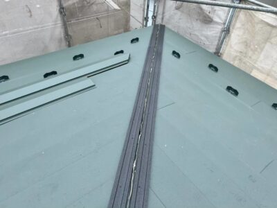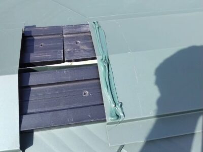 強度及び耐久性が強いので台風などの強風の影響で浮き上がる心配がありません。棟板金のジョイント部も専用シーリング材で防水性をしっかりと確保します。