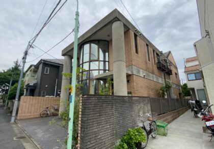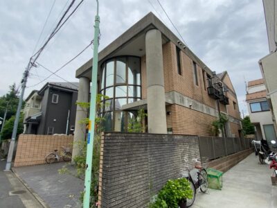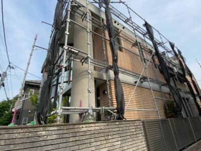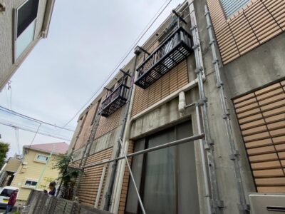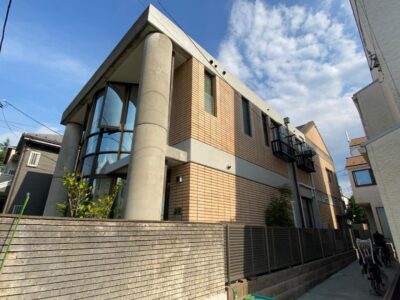 鉄筋コンクリート建物 外壁塗装 タイル目地 シーリング 散水調査 雨漏り止水 雨樋ジョイントシール コンクリート打ち放し素地パターン付け塗装 部分足場組立 杉並区阿佐ヶ谷北N様