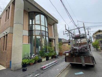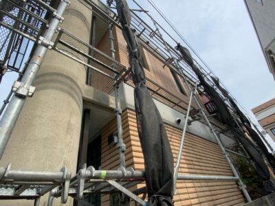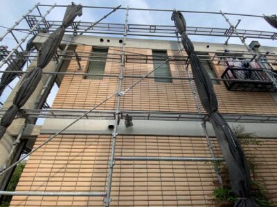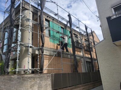 2面足場組立のために足場つなぎの打ち込み固定をして、更に養生メッシュシートは、塗装作業前に貼る段取りとして強風の影響を受けない対策としています。