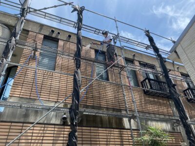 外壁塗装を行う上で必ず必要な工程の1つが外壁洗浄です。 現状の外壁の汚れを洗い落とし、清潔な状態にしてから下塗りを行うことは外壁塗装の塗膜の密着性を高めるために不可欠な作業です。