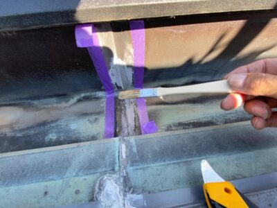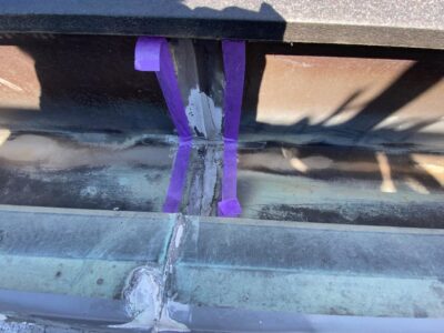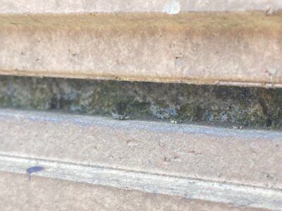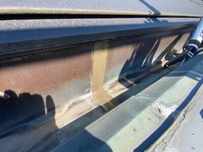 内樋内のジョイント部のシーリングが劣化し失われ雨漏りのリスクがあります。
