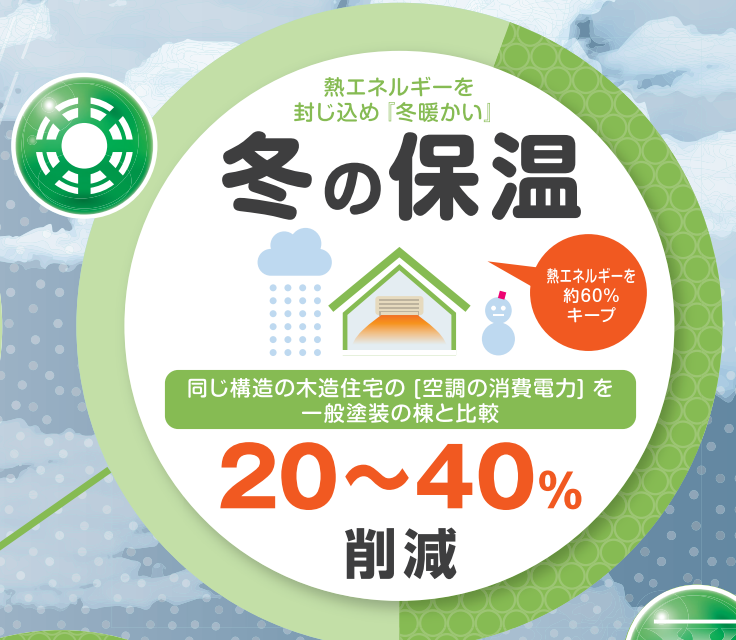建物の内外壁に塗るだけで暑さ寒さをはね返すので、夏は涼しく冬は暖かく、冷暖房効率が高まり省エネに貢献します。