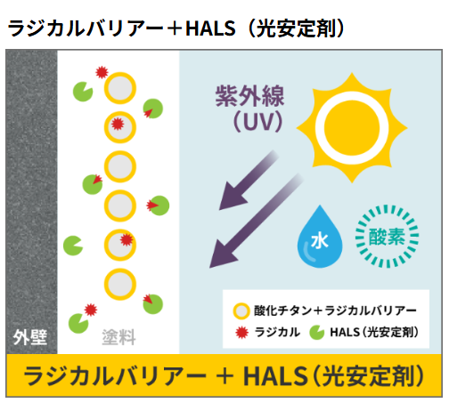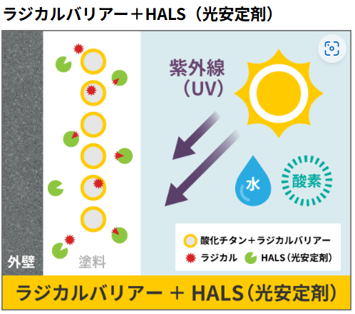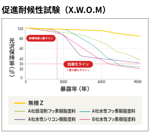 ガイソーウォール無機Zは、紫外線や熱に起因する劣化に強く、耐候性に優れています。フッ素樹脂塗料を凌ぐ耐候性が期待でき、ライフサイクルコストを抑えることができます。無機物の耐久性や耐候性を活かした有機と無機のいいとこ取りのハイブリット塗料です。