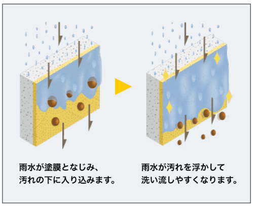 無機塗料は有機樹脂塗料よりも静電気が起きにくいため、ゴミ等の汚れがつきにくいのが特徴です。苔や藻の栄養分である有機物質の含有量が少ないため、苔や藻の発生を抑制します。雨筋汚れに強くきれいな外壁を維持します。また、親水性塗膜による汚れを洗い流すセルフクリーニング効果もあるので、雨が降るたびに外壁表面の汚れが雨と一緒に流れ落ちます。
