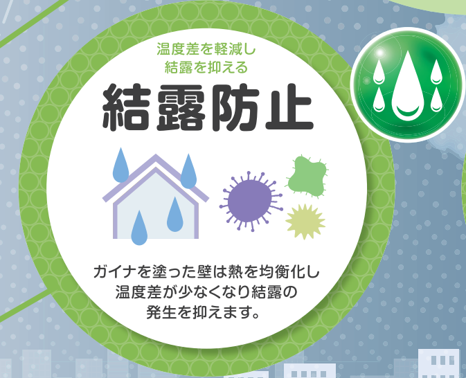 GAINAの塗膜は周辺の温度変化に適応する特性があり、室温に合わせて同じ温度に近づきます。熱の移動を少なくすることで温度差が小さくなり、結露の発生を抑えることができます。