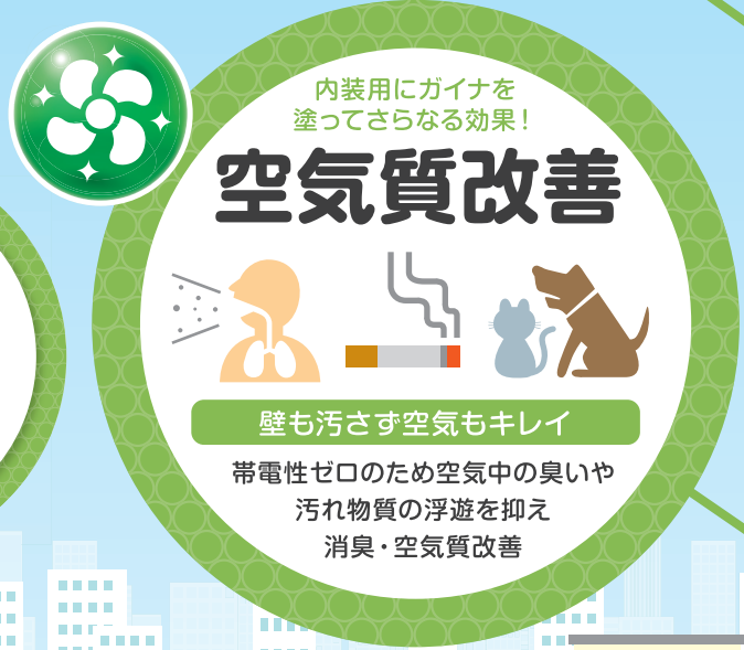 GAINAは帯電性0.0の性質を持っており、汚濁物質付着しにくい性質を備えています。イオン化した水分が空気中に浮遊している汚濁物質と結合し、汚濁物質を浮遊しにくくします。クリーンな空気を作り出し、臭いを抑えることができます。