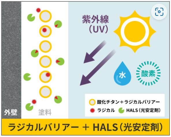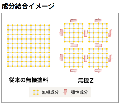 主成分がガラスや鉱物などの無機成分で構成されているため、有機塗料と比べると火事などの際にも燃えにくいとされています。必ずしも燃えないというわけではありませんが、万が一の際に二次災害の確率を低くすることが期待できます。また、耐久性が高いがひび割れしやすい無機物と柔軟性があるが劣化しやすい有機物それぞれの弱点を補うことで柔軟性と高硬度を兼ね備えた塗膜を実現しました。