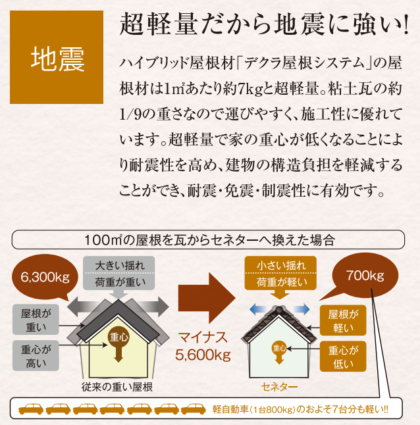 超軽量で家の重心が低くなることにより耐震性を高め、建物の構造負担を軽減することができ、