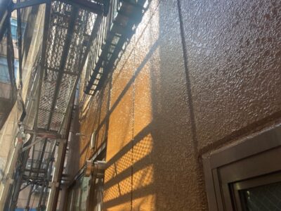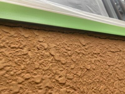 3回塗りの2回目の中塗り作業です。手塗りのローラー工法で、3回も塗り重ねることを標準仕様としています。従来の吹き付け工法とは違い、施工実績豊富な職人が手塗りローラー工法で何度も塗料を重ね塗りすることによって、長期に渡り美しく耐久性の強い塗膜を生み出します。