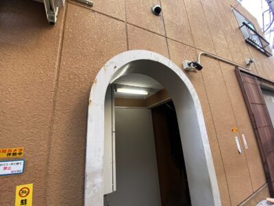 外壁に壁つなぎアンカー打ちを行い、1階の建物入り口は出入りが出来るような組立を行いパイプコーナーガードなどを要所に設置します。