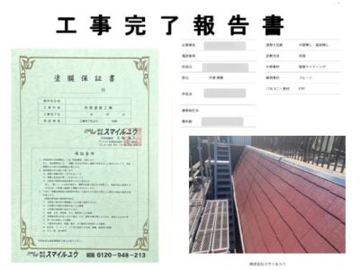 お引渡しの後に工事完了報告書と工事保証書を提出させて頂きます。工事後も安心してお住まい頂けますよう保証内容や細部までしっかりと施工をした状況が確認できます。