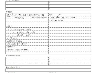 現地調査では建物の気になっている状態や外壁塗装をする目的などを詳しく伺って「現調打合せ記録」に記録をします。