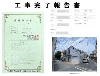 お引渡しの後に工事完了報告書と工事保証書を提出させて頂きます。工事後も安心してお住まい頂けますよう保証内容や細部までしっかりと施工をした状況が確認できます。