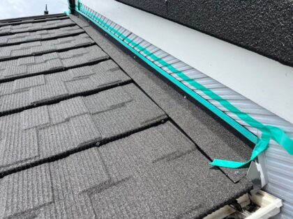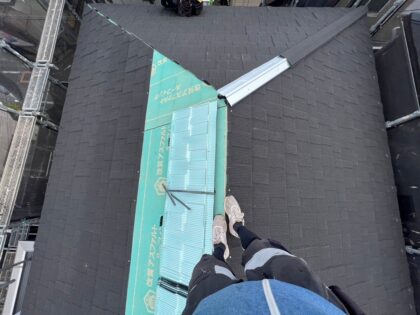 先端部から屋根材を設置していきます。屋根の雨水が雨樋に流すための大切なパーツです。