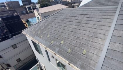 既存屋根材はスレート屋根です。石質の薄い板を使用しているため、劣化や反りがしやすい材料です。