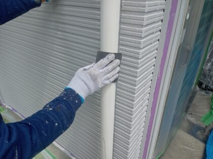 塩ビ雨樋を塗装前にペーパー目あらし処理をしています。