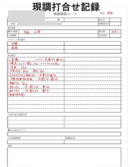 現地調査では建物の気になっている状態や外壁塗装をする目的などを詳しく伺って「現調打合せ記録」に記録をします。