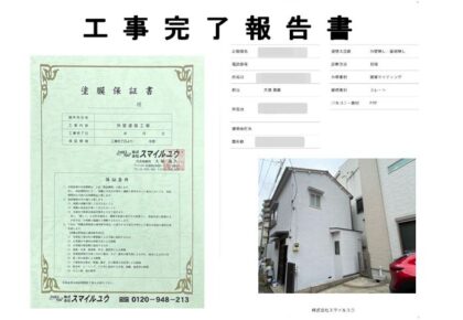 お引渡しの後に工事完了報告書と工事保証書を提出させて頂きます。工事後も安心してお住まい頂けますよう保証内容や細部までしっかりと施工をした状況が確認できます。