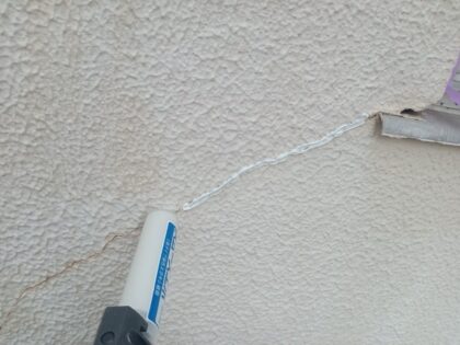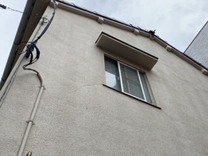 外壁の至る所にクラック(ひび割れ)が見受けられます。今は細いクラックでも放置すると次第に大きくなり、建物の耐久に悪影響を及ぼすため、塗装する前にクラックを補修する必要があります。