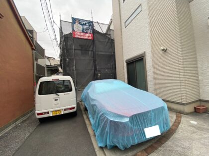 お客様の車にバイオ洗浄の水や塗料がかからないよう養生させていただきます。