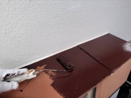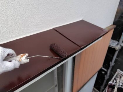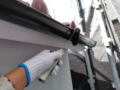軒樋の仕上げ塗装です。ローラーが使えない狭い箇所などは、ハケでしっかりと塗り込みます。