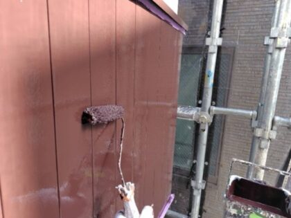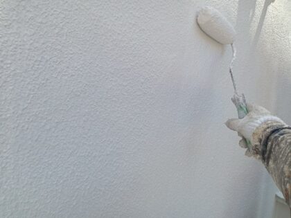 3回目に塗る仕上げ外壁塗装です。塗料によって決まっている標準塗布量や乾燥時間をしっかりと守ることにより、強い塗膜を作ります。ローラーが使えない狭い箇所などは、ハケでしっかりと塗り込みます。同じ塗料を使用しても、塗り方によって耐久性が全く違ってきます!