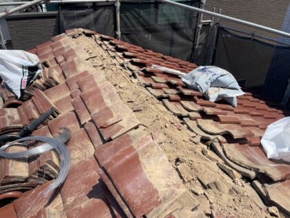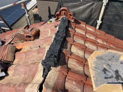 屋根瓦の漆喰と葺き土の詰め直しのため、棟瓦を一時的に撤去します。