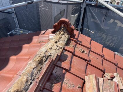 既存の屋根棟瓦の漆喰と葺き土を撤去します。