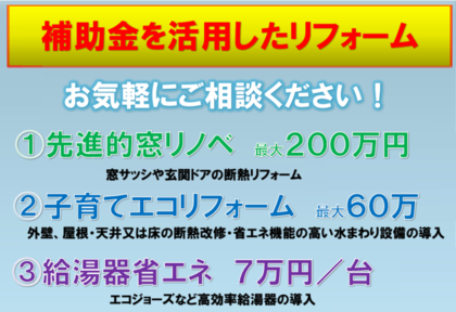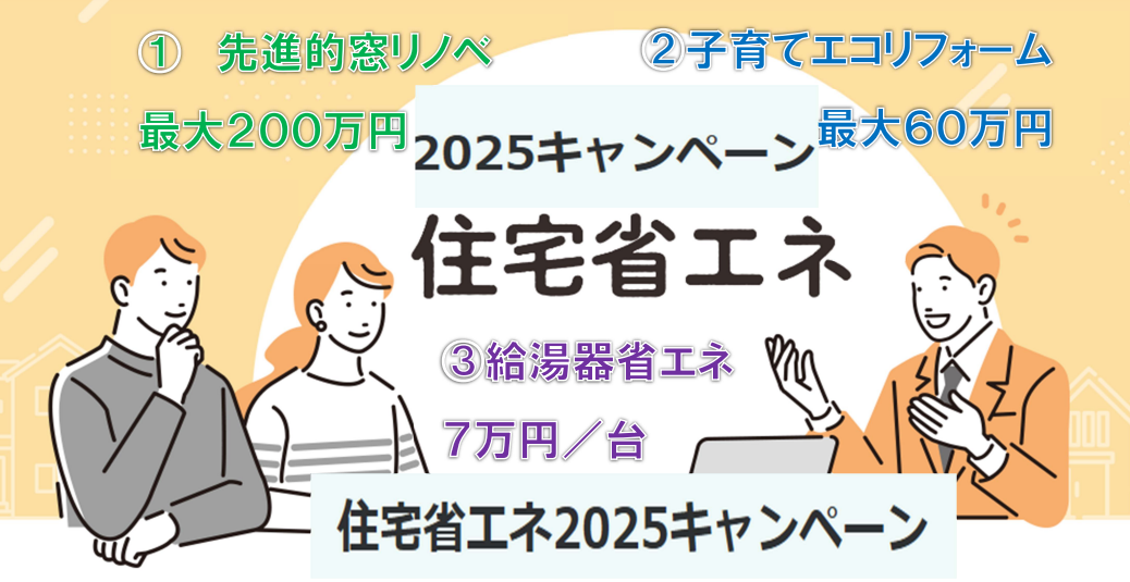 ①先進的窓リノベ2025事業 ②子育てエコリフォーム支援事業 ③給湯器省エネ | ||||