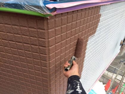 3回目に塗る仕上げ塗装です。塗料によって決まっている標準塗布量や乾燥時間をしっかりと守ることにより、強い塗膜を作ります。ローラーが使えない狭い箇所などは、ハケでしっかりと塗り込みます。同じ塗料を使用しても、塗り方によって耐久性が全く違ってきます!