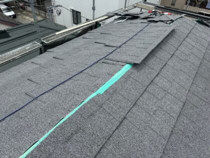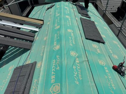屋根から漏水しないよう、防水シートを水下から水上方向へ100mmの重ねをとりながら貼ります。上側のシートが下側のシートに上からかぶることで屋根の下に雨水が入ることを防ぎます。