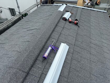 先端部から屋根材を設置していきます。屋根の雨水が雨樋に流すための大切なパーツです。先端部に屋根材を設置したら、次は中央にかけて屋根材を設置していきます。