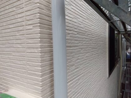 塩ビ雨樋を塗装前にペーパー目あらし処理をし、仕上げ塗料材料を塗布します。